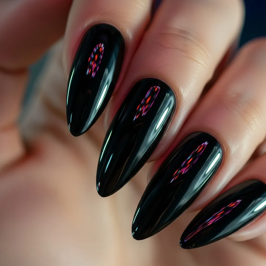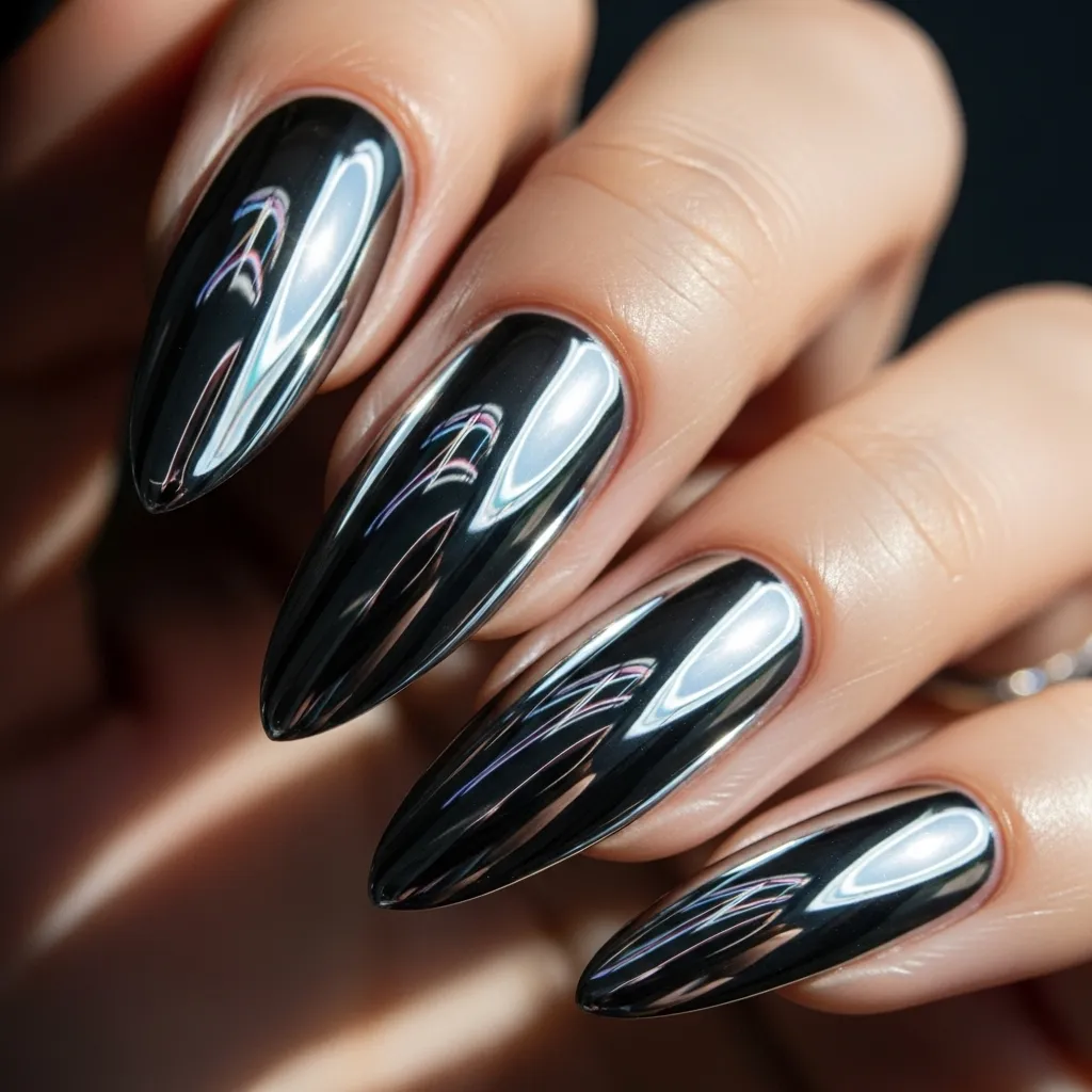 Black chrome nails combine mystery and glamour. Their deep, reflective shine creates an edgy, bold statement perfect for parties, evening events, or fashion-forward occasions. Ideal for those who love dramatic nails, black chrome highlights sophistication while keeping a modern edge. Easy to style and maintain, these nails pair perfectly with dark or vibrant outfits, statement accessories, and bold makeup. Black chrome nails are a must-have for fashion lovers seeking bold, chic nail designs.