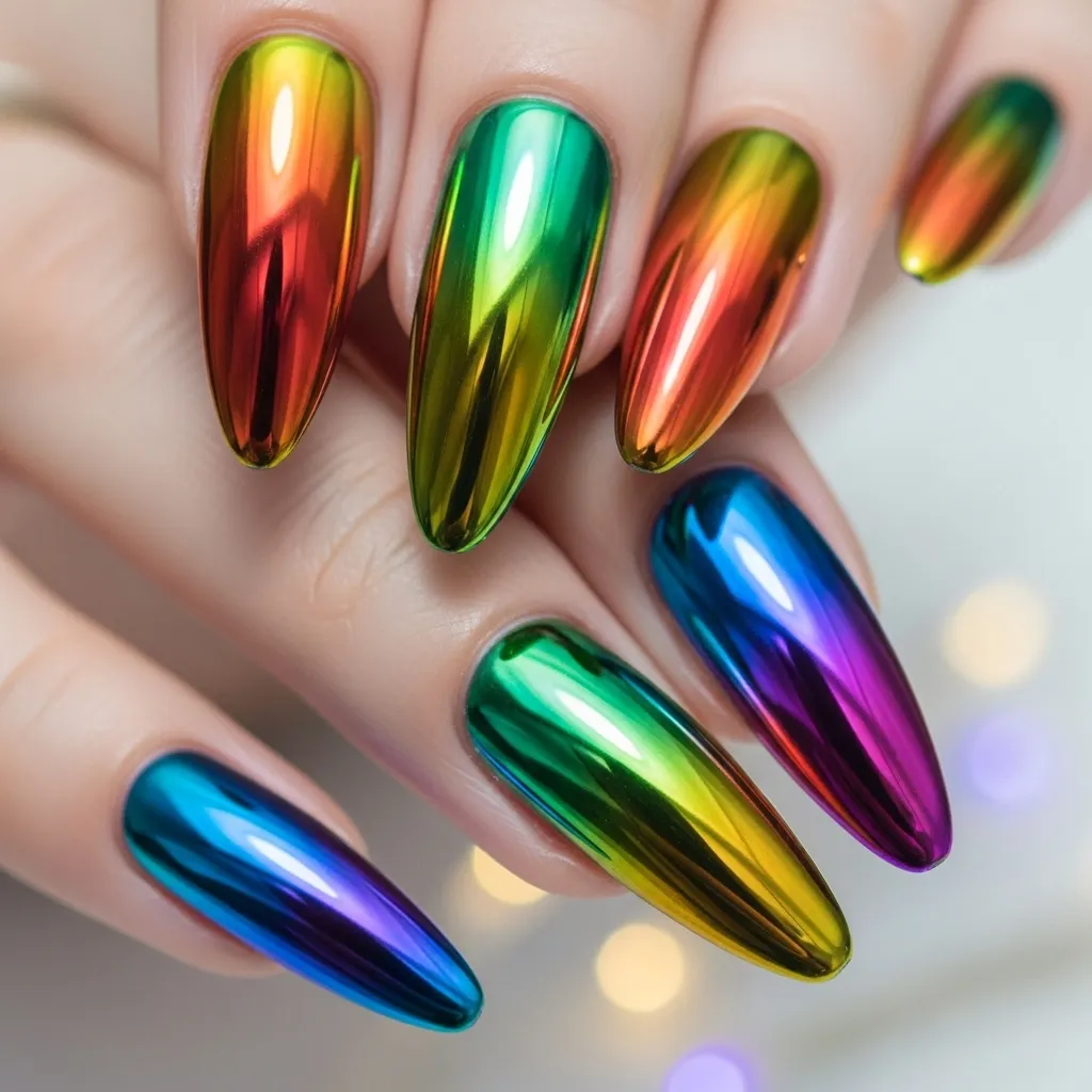 Rainbow chrome nails are fun, playful, and perfect for fashion lovers who love bold colors. Their reflective, multi-colored effect adds energy and vibrancy to any outfit. Ideal for festivals, parties, or casual glam, rainbow chrome nails make a statement while remaining chic. They can be paired with minimal accessories or colorful outfits for a coordinated look. Rainbow chrome nails are the ultimate trend for bold, creative, and fashion-forward individuals.