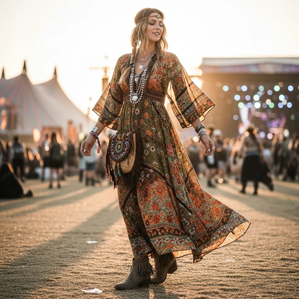 The boho chic maxi dress is a festival classic that radiates comfort and style. Its flowing silhouette pairs beautifully with floral prints, layered accessories, and ankle boots for a complete look. Perfect for outdoor music festivals, this outfit not only looks stunning but also allows free movement for dancing. Its relaxed vibe makes it versatile, and when styled with braided hair or a floppy hat, it instantly gives off bohemian goddess energy.A boho chic maxi dress is one of the most iconic festival outfit choices, combining comfort with effortless beauty.