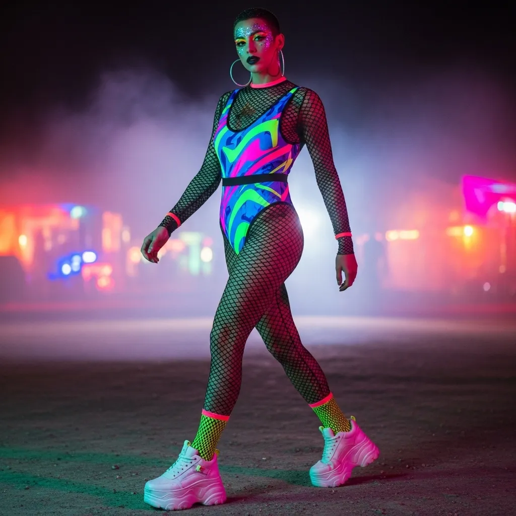 The neon bodysuit with a fishnet overlay is for fearless fashion lovers who want to stand out. Bright neon ensures all eyes are on you, while fishnet adds an edgy, layered twist. This outfit works perfectly with chunky sneakers, bold hoop earrings, and glitter makeup, creating a daring yet functional look. It’s designed for those who love to dance, shine, and embrace the fun side of festival fashion.