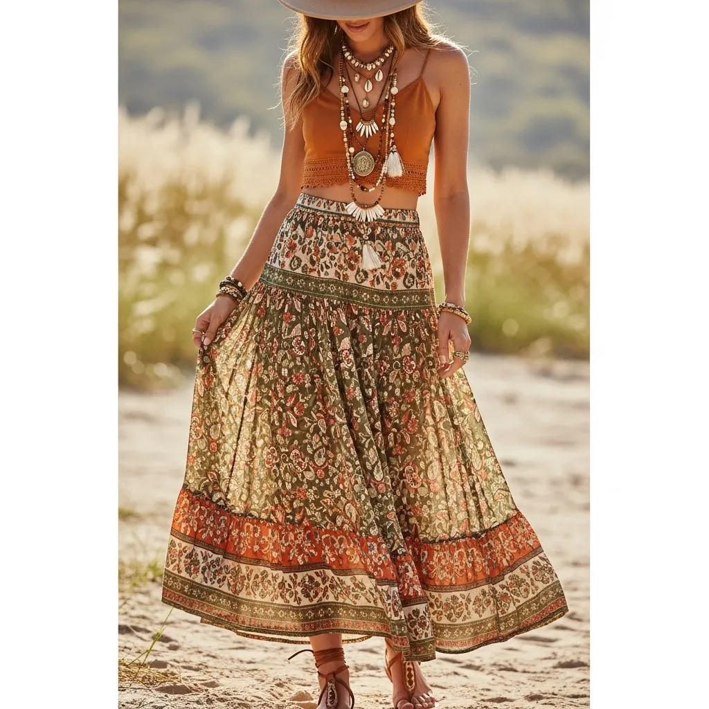 The maxi skirt with a crop top is the perfect mix of romance, comfort, and style, making it a beloved choice for festivals. Maxi skirts bring a sense of flowing elegance, moving gracefully as you walk or dance, while crop tops balance the volume with a fitted, modern touch. Together, they create a flattering silhouette that is both relaxed and chic.Bohemian-inspired maxi skirts often feature patterns such as florals, paisleys, or tribal prints, though solid colors in earthy tones can feel equally stylish. Their lightweight fabrics make them ideal for warm weather, while the length offers versatility—you can lounge on the grass comfortably or twirl in rhythm with the music.