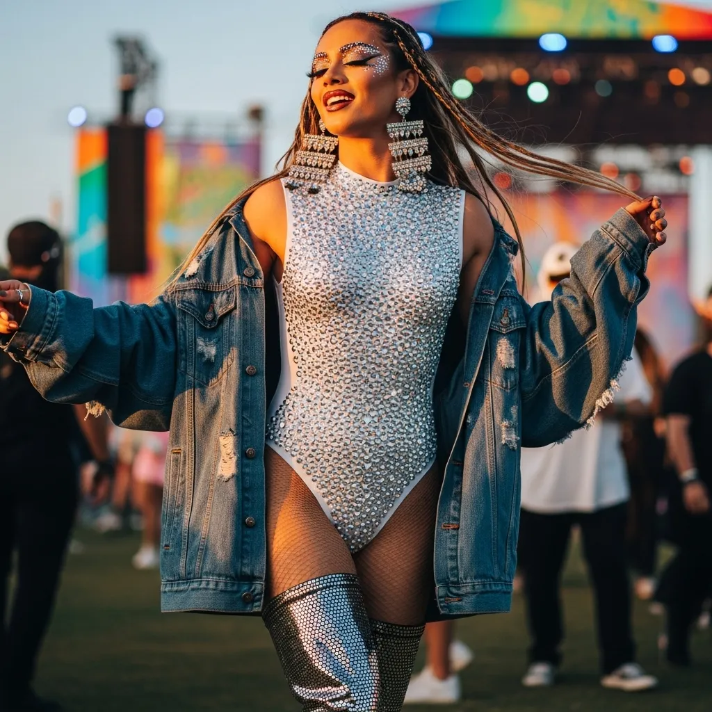 The rhinestone bodysuit with an oversized jacket is the perfect mix of glam and streetwear. The bodysuit sparkles under stage lights, while the oversized jacket adds a casual edge. Paired with thigh-high boots and bold accessories, this look is confident and daring. It’s ideal for festival-goers who love making a statement without sacrificing comfort, offering both dazzling glamour and effortless layering versatility.