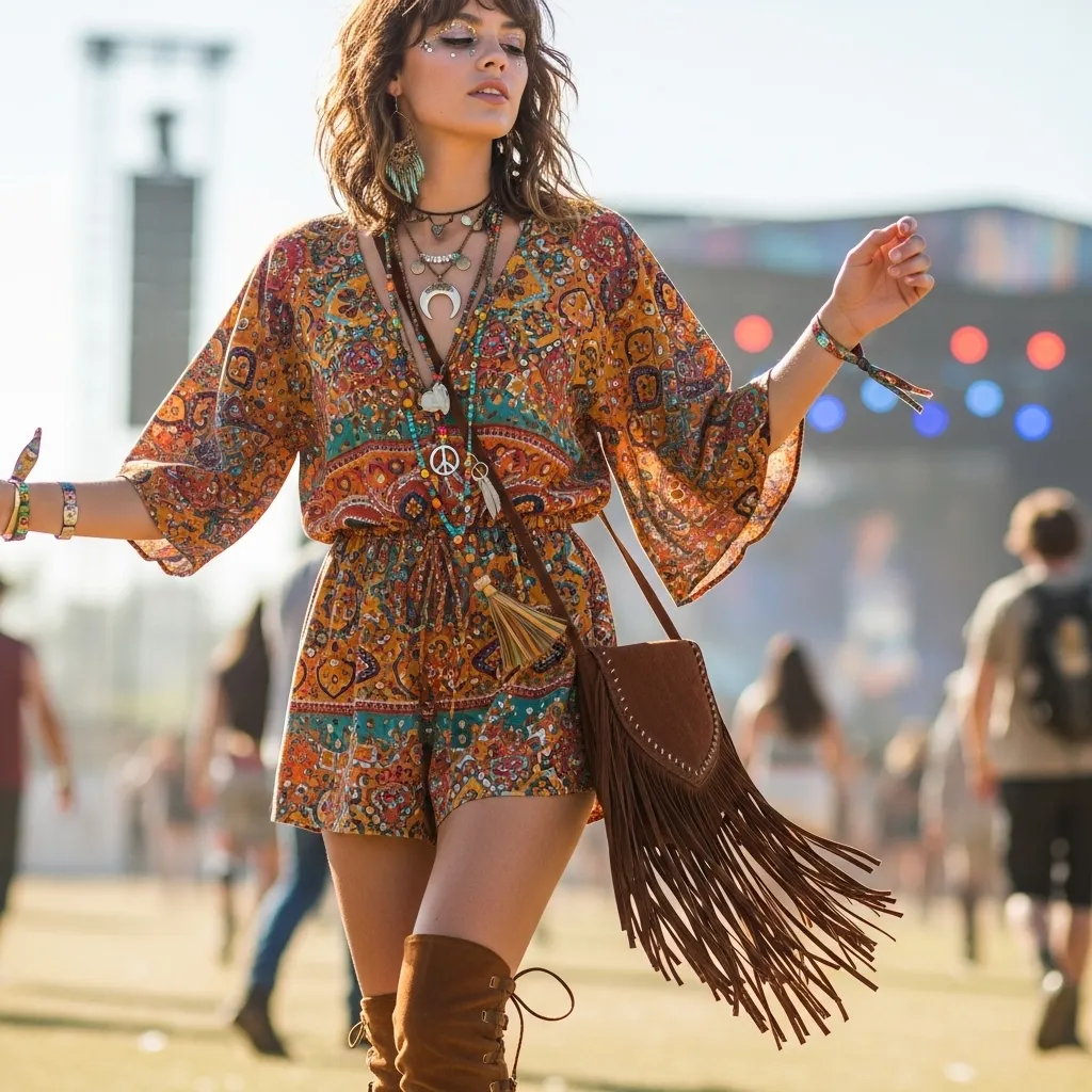 The boho romper with a fringe bag is a festival outfit that perfectly blends comfort with free-spirited style. Rompers are a go-to choice for their ease—they’re lightweight, breathable, and allow for unrestricted movement, making them ideal for days filled with dancing and exploring. When designed with bohemian patterns like florals, paisleys, or geometric prints, rompers exude a carefree charm that feels right at home in festival culture.