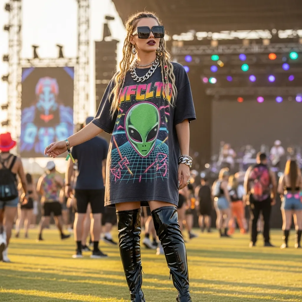 The oversized graphic tee with thigh-high boots brings urban streetwear into festival fashion. Worn as a dress, the tee exudes casual cool, while thigh-high boots add edge and confidence. Styled with bold sunglasses and chunky jewelry, the outfit is effortlessly stylish and practical for long festival days. It’s a great choice for those who want comfort without sacrificing bold personality, blending street-inspired energy with festival-ready flair.