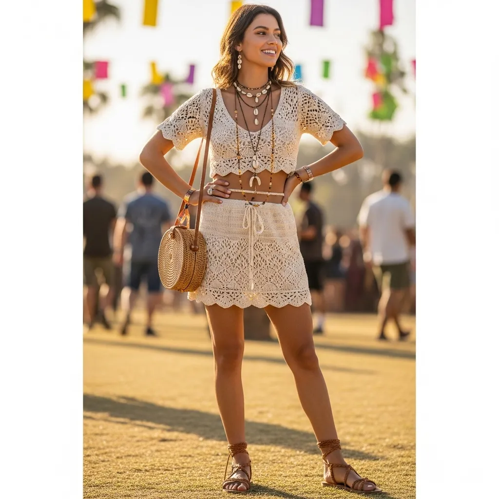 Crochet outfits have become synonymous with festival fashion, and the crop top with skirt set is among the most beloved. Handcrafted crochet designs embody individuality, artistry, and free-spirited style, making them perfect for events that celebrate creativity. The breathable fabric keeps you comfortable even in the summer heat, while the open-weave design adds texture and a playful peek-a-boo effect that’s chic yet relaxed.The crop top and skirt set can be styled in countless ways. A matching set in neutral colors exudes understated elegance, while bright multicolored crochet pieces make a bold, eye-catching statement. Paired with a woven crossbody bag, layered necklaces, and strappy sandals, the look feels effortlessly coordinated. Hairstyles like loose waves, braids, or flower crowns further enhance the bohemian aesthetic.