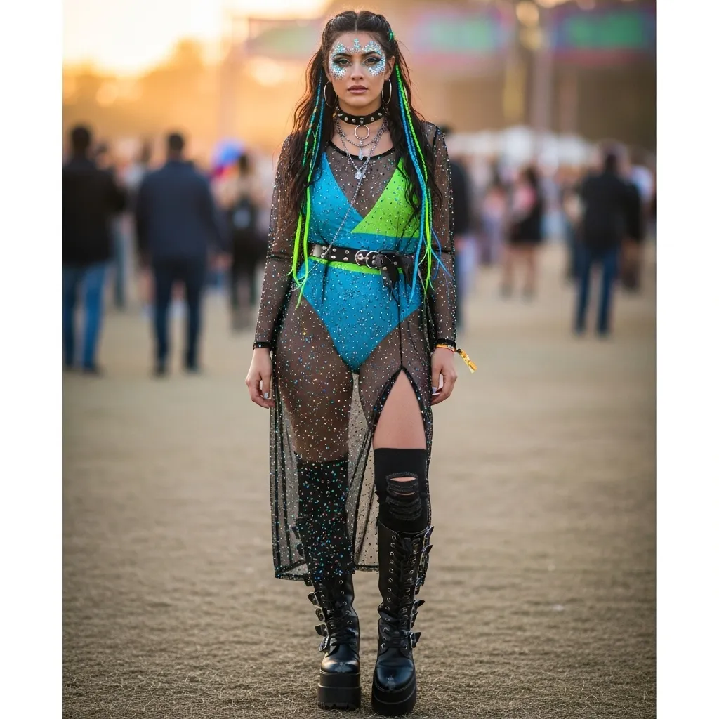 The sheer mesh dress layered over a bodysuit is bold, edgy, and perfect for those who want to push fashion boundaries. With eye-catching neon hues, statement chokers, and chunky boots, this outfit stands out in any crowd. It’s both daring and stylish, balancing playful transparency with structured layering. Add glitter makeup or body jewels to enhance the vibe, and you’ve got a fearless look ready for music-filled festival nights.