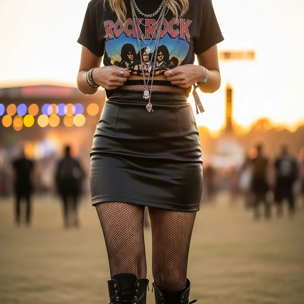 A vintage band tee paired with a leather skirt is edgy, stylish, and perfect for music lovers who want to pay homage to rock legends. Adding fishnets, chunky boots, and bold accessories enhances the rebellious vibe. The mix of casual and chic makes this outfit versatile, ideal for both daytime sets and night concerts. With effortless coolness, this look celebrates festival fashion at its grungiest yet trendiest.The vintage band tee with a leather skirt is an iconic outfit that blends music culture with fashion-forward festival style. It’s a nod to the rebellious energy of rock concerts while maintaining a chic edge, making it perfect for music festivals of all genres.