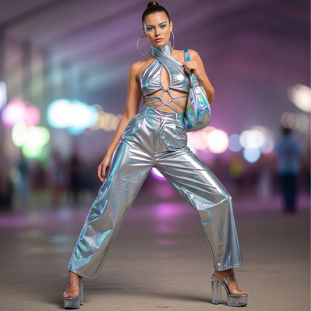 The reflective sheen of metallic fabrics catches light beautifully, creating a mesmerizing effect during the day and glowing even brighter under night lights. Combined with the timeless appeal of a halter top, this look strikes the perfect balance between edgy and chic.Metallic pants come in a variety of cuts—from wide-leg, high-waisted designs to skinny fits—allowing you to choose based on your personal preference. Wide-leg metallics paired with platforms evoke a disco-inspired vibe, while slim-fit metallics with chunky sneakers feel edgy and modern. The halter top complements the pants by adding a sleek silhouette, keeping the look balanced and festival-ready.