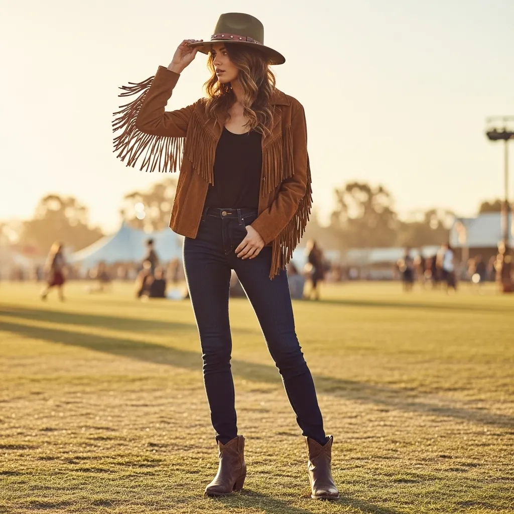 The fringe jacket with skinny jeans is a classic festival outfit that merges western flair with modern style. Fringe detailing is eye-catching and dynamic, moving with every step or dance move, making it one of the most fun elements to wear at a festival. Paired with the simplicity of skinny jeans, the look feels balanced—playful yet sleek.