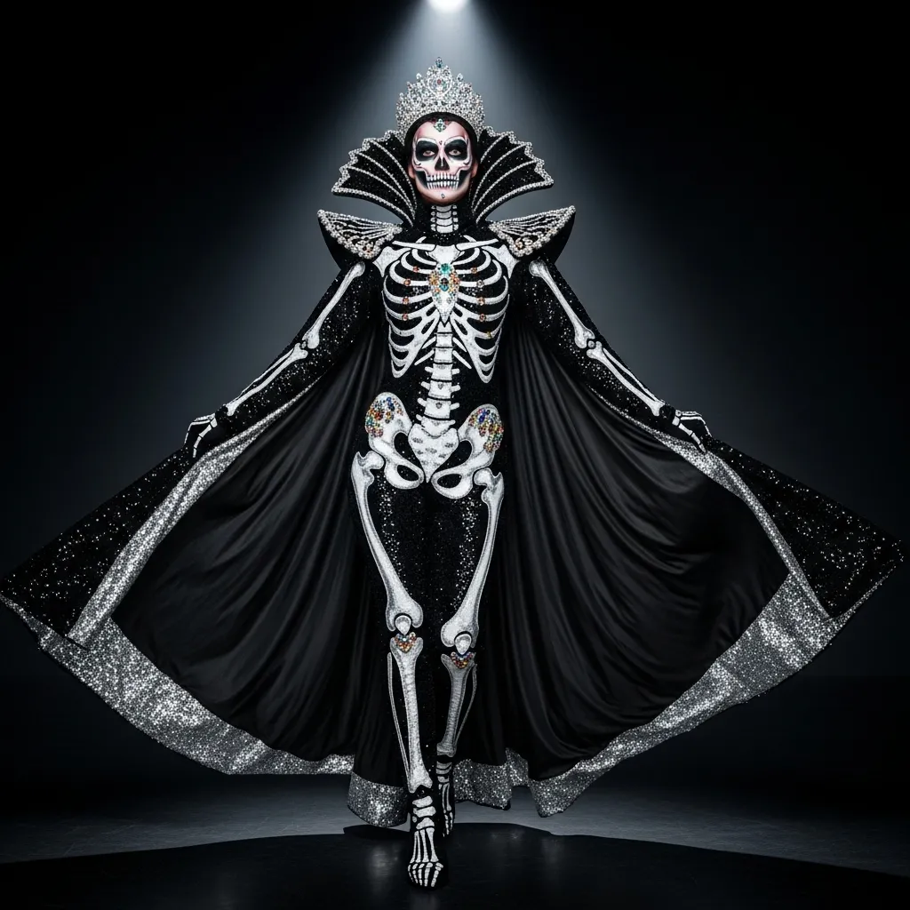 The skeleton outfit doesn’t have to be basic; with a little glam, it becomes a showstopper. Instead of just a printed bodysuit, try a sequined jumpsuit or glitter-embellished skeleton design. Rhinestones outlining bones on sheer fabric create a jaw-dropping effect. Add black boots or heels to polish off the outfit.