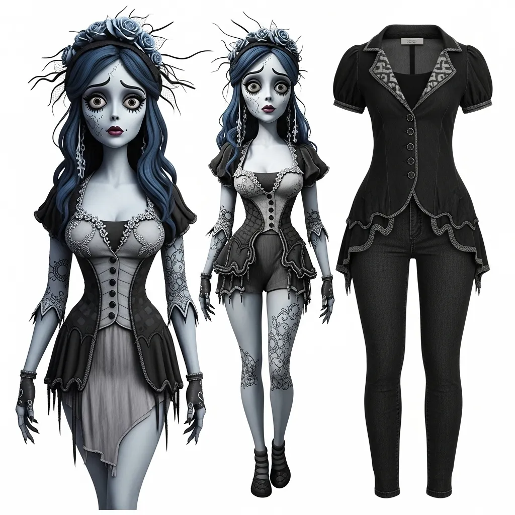 A Corpse Bride costume is hauntingly beautiful, inspired by the Tim Burton classic. The foundation of this look is a tattered wedding dress—white or pale blue with distressed edges. A long, flowing veil with lace detailing and a flower crown enhances the look. To create the undead bride vibe, go for pale makeup, dark eyes, and blue or gray tones on the skin.