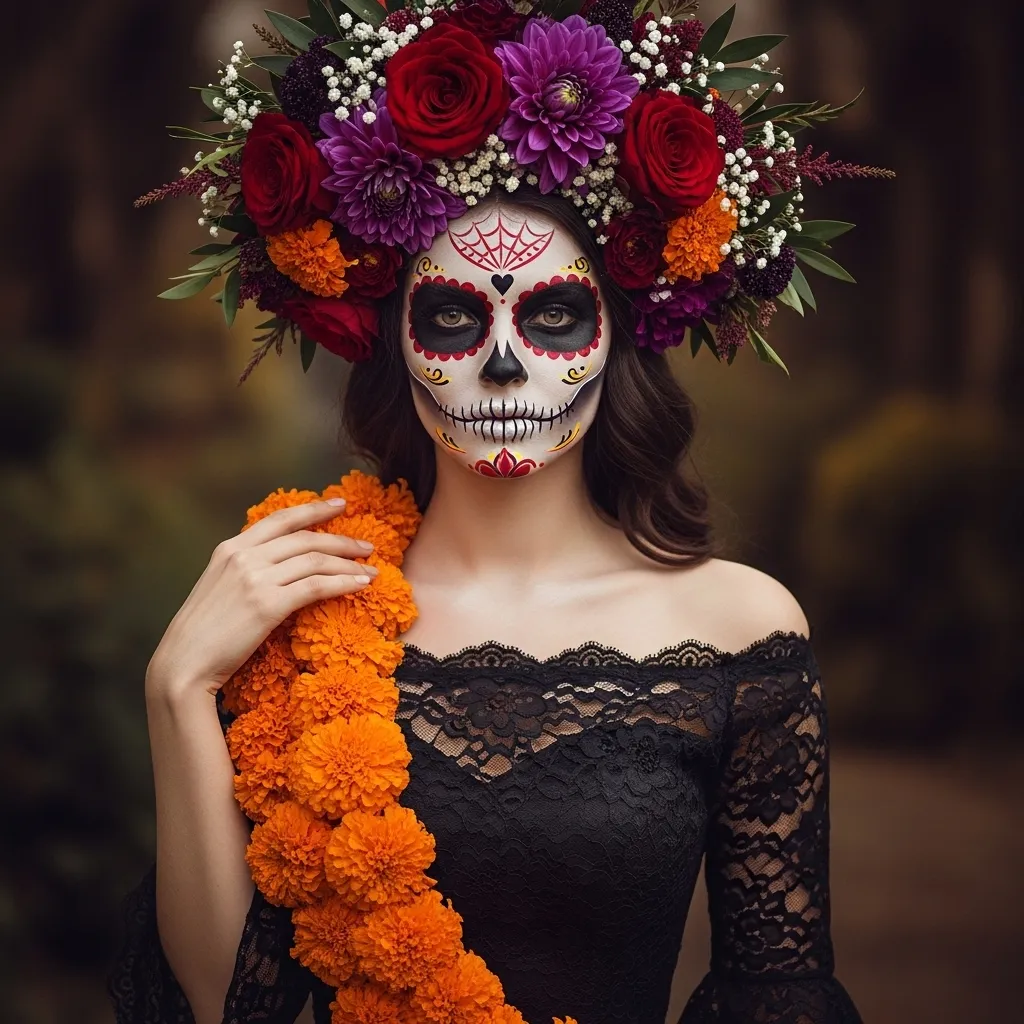 This Mexican-inspired design is both cultural and artistic. A black or red lace gown sets the stage, while a colorful floral crown makes it vibrant. The centerpiece is sugar skull makeup—intricate face painting featuring flowers, swirls, and rhinestones. Marigolds as accessories or props add authenticity.