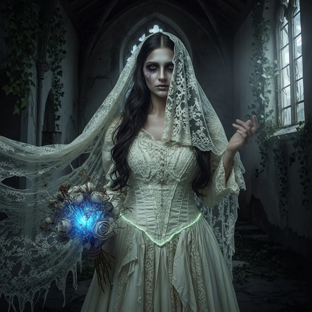 For makeup, pale foundation with gray shading creates a spectral look. Dark, hollowed eyes paired with subtle tears drawn in black or gray amplify the chilling aura. A touch of glitter or white contacts adds to the supernatural effect. The ghostly bride design blends gothic romance with spine-chilling presence, making it a favorite for parties, haunted houses, or themed photo shoots.