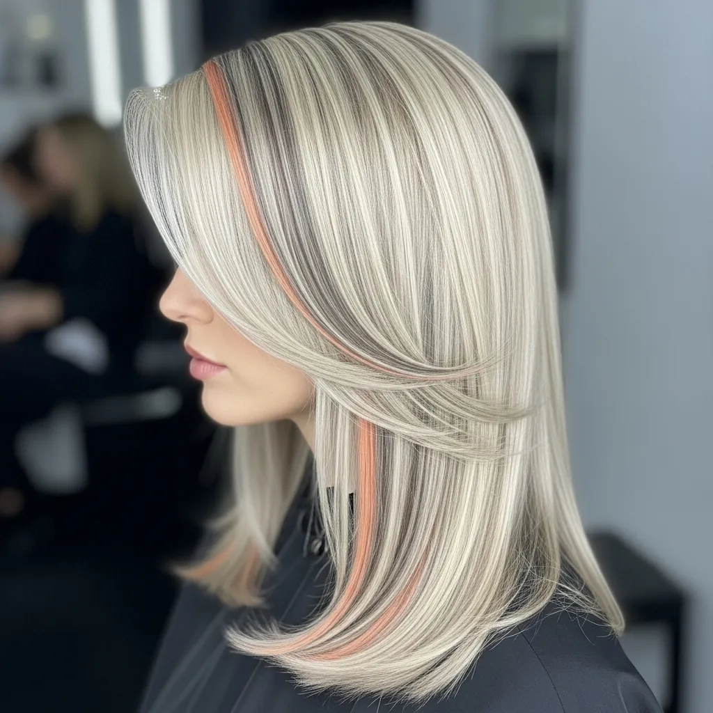 For a luxe, editorial vibe, mix platinum blonde with streaks of ash brown, peach, and subtle copper. The icy tones paired with warmth create a high-fashion, modern look.