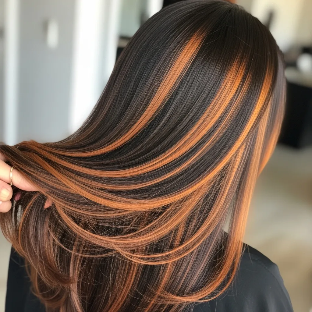 For those who prefer a more mysterious vibe, opt for dark brown and black as the base, with copper and golden streaks woven throughout. The contrast creates depth while keeping it elegant.
