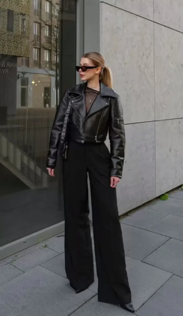 For accessories, reach for a black velvet clutch or leather mini bag with metallic hardware. Gold or pearl jewelry adds a touch of luminosity without breaking the monochrome palette. Finish with sleek, pulled-back hair, winged liner, and a classic red or wine-colored lip. It’s dramatic, refined, and powerful perfect for evening events or high-impact minimalism.