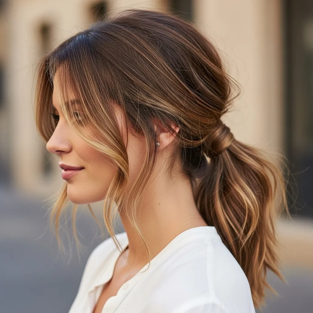 The low messy ponytail is casual, stylish, and effortless, ideal for everyday wear, brunches, casual evenings, or informal gatherings. This hairstyle keeps hair controlled while maintaining a relaxed, laid-back charm. To create it, gather hair at the nape of the neck and secure loosely with a hair tie. Pull out a few strands around the face for softness and gently tug at the ponytail to add volume.