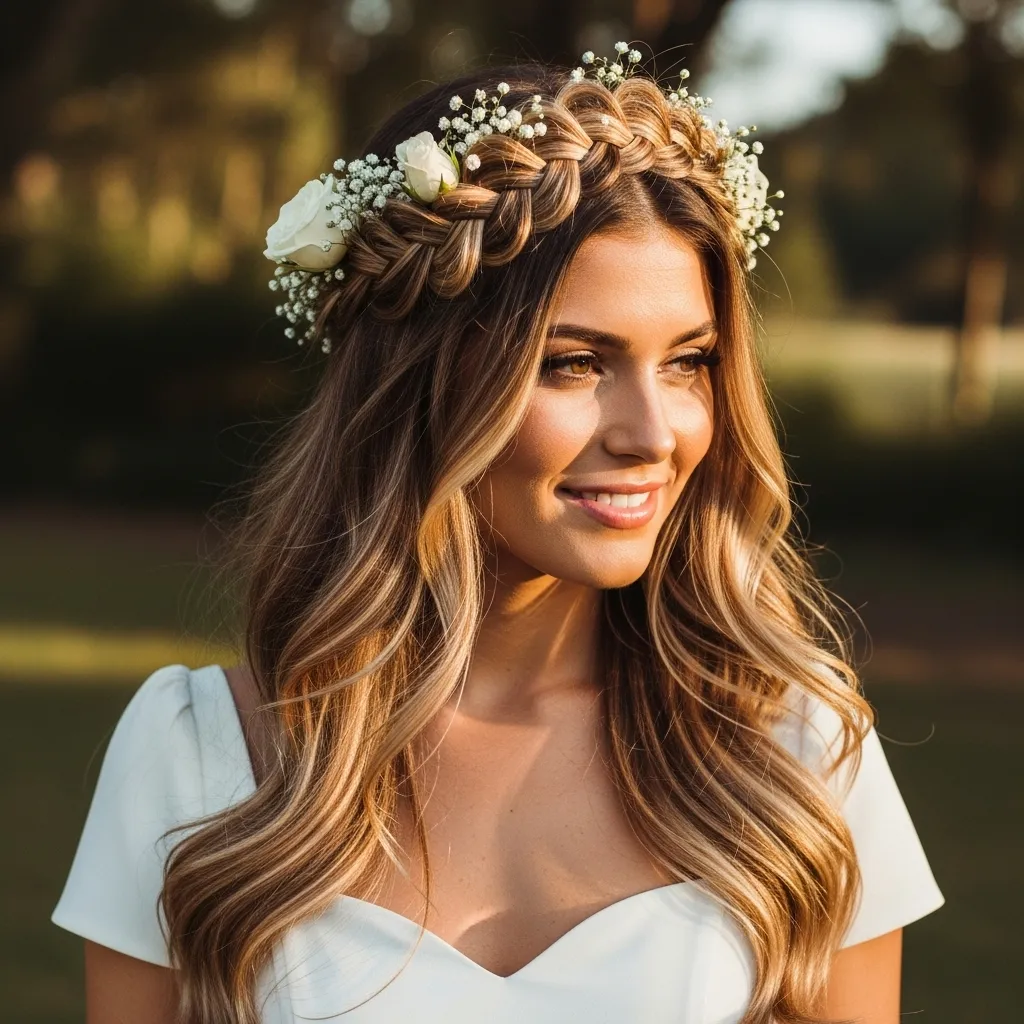 This hairstyle works best on medium to long hair and complements a variety of outfits—from casual dresses to semi-formal ensembles. It keeps hair controlled while maintaining softness around the face. The half-up braided crown offers versatility: you can make the braids tight and structured for elegance or loose and messy for a relaxed, bohemian vibe. It’s perfect for women who want a cute, charming hairstyle that balances sophistication, playfulness, and practicality.