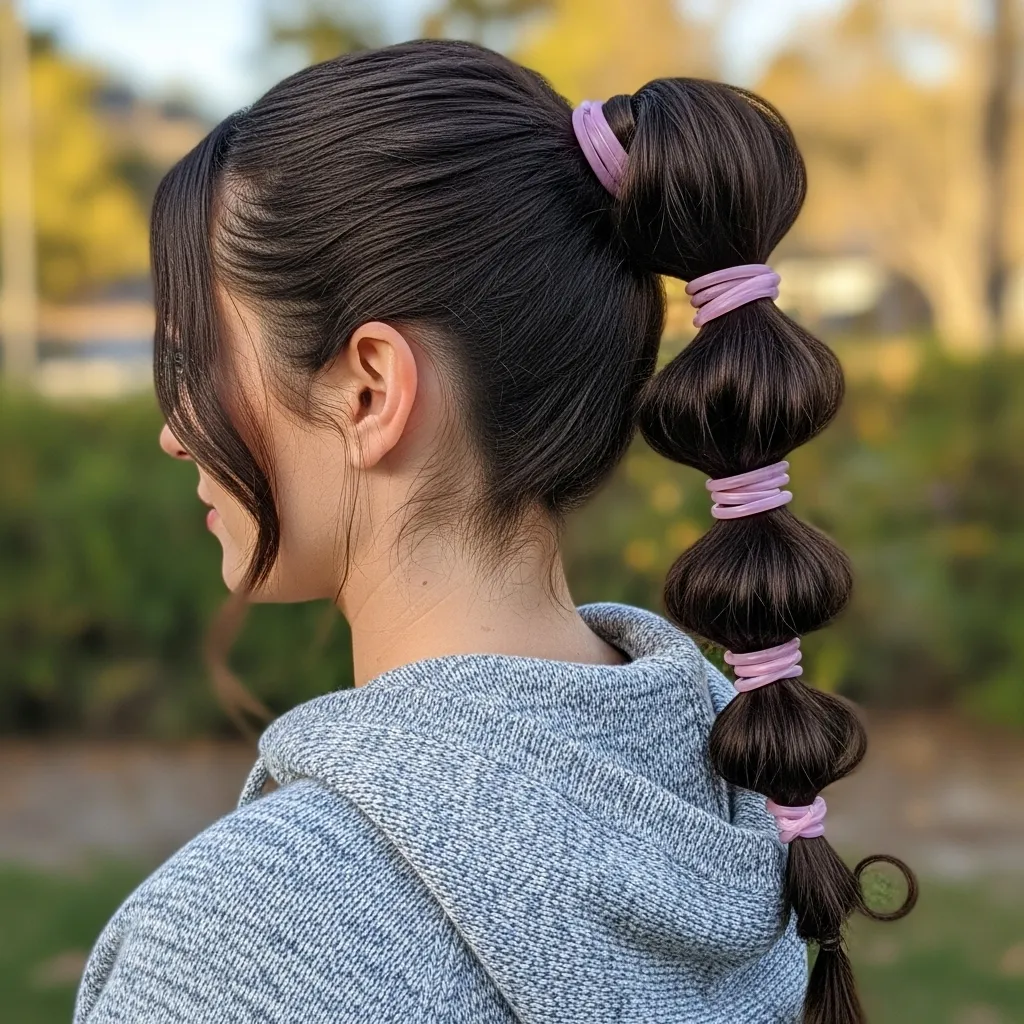 The bubble ponytail is playful, trendy, and visually striking, perfect for casual outings, parties, or sporty-chic looks. This hairstyle adds volume, dimension, and a fun twist to a standard ponytail. To create it, secure hair in a high or mid-level ponytail, then divide the ponytail into sections, securing each with hair ties to form “bubbles.” Gently pull on each section for volume and movement.