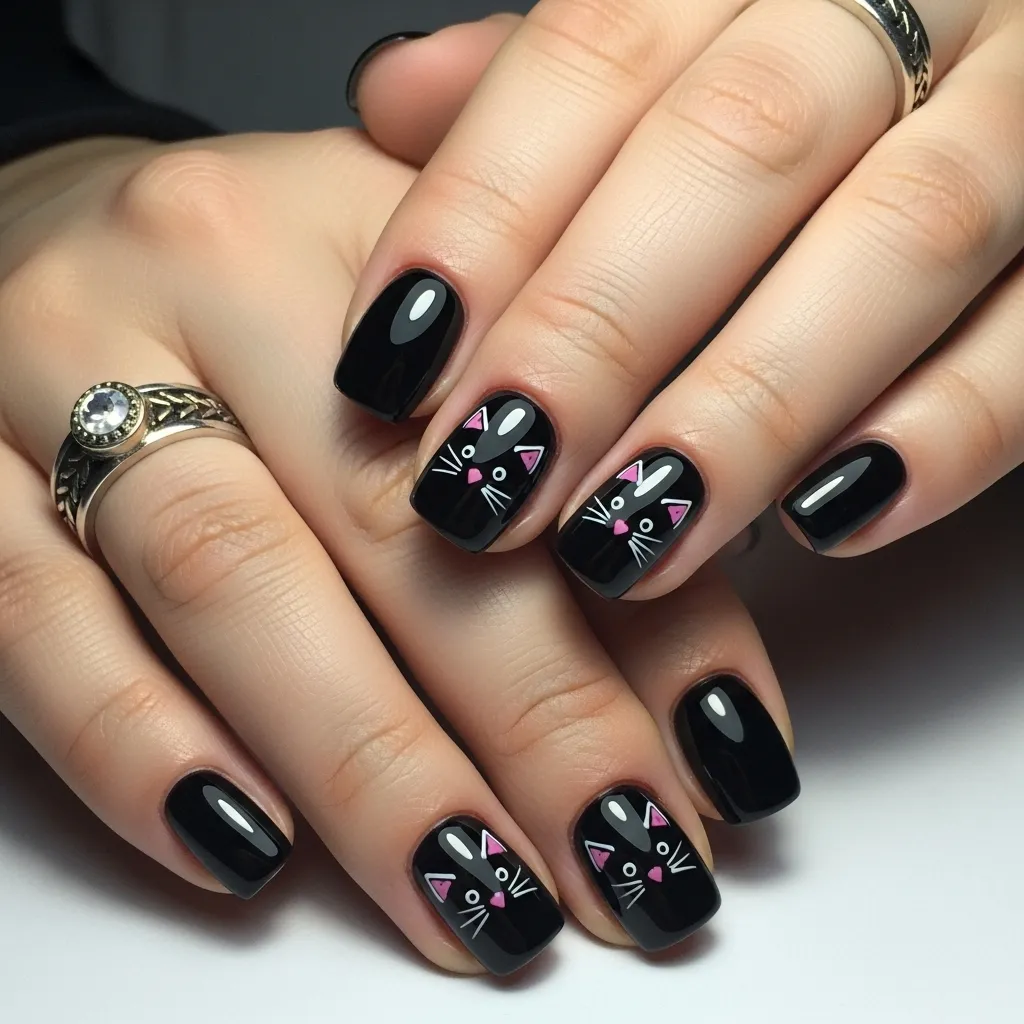 This design works best on almond or oval nails where the elongated shape complements the cat motif. Adding a pop of glitter or a crescent moon detail makes the design even more festive and stylish.