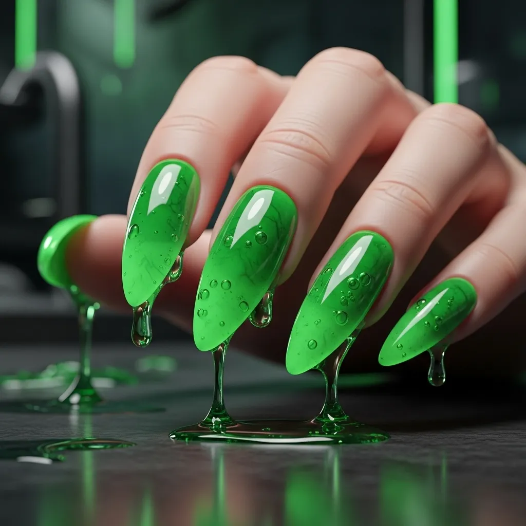 Slime nails work especially well on coffin or square shapes, where the drip design can flow naturally. Adding glitter gives them a glowing, magical vibe.
