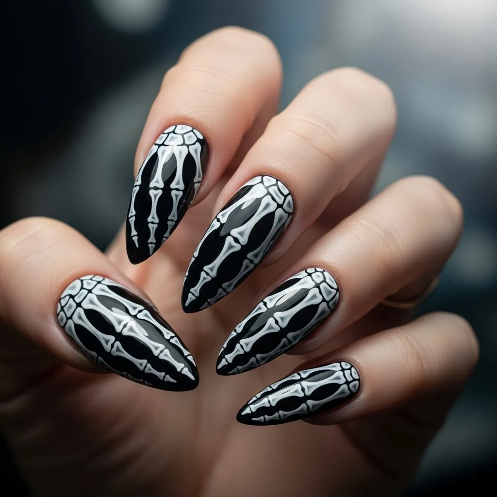 Skeleton nails are iconic for Halloween, especially when painted to resemble bony fingers across the nails. A black-and-white palette makes the design crisp and bold.