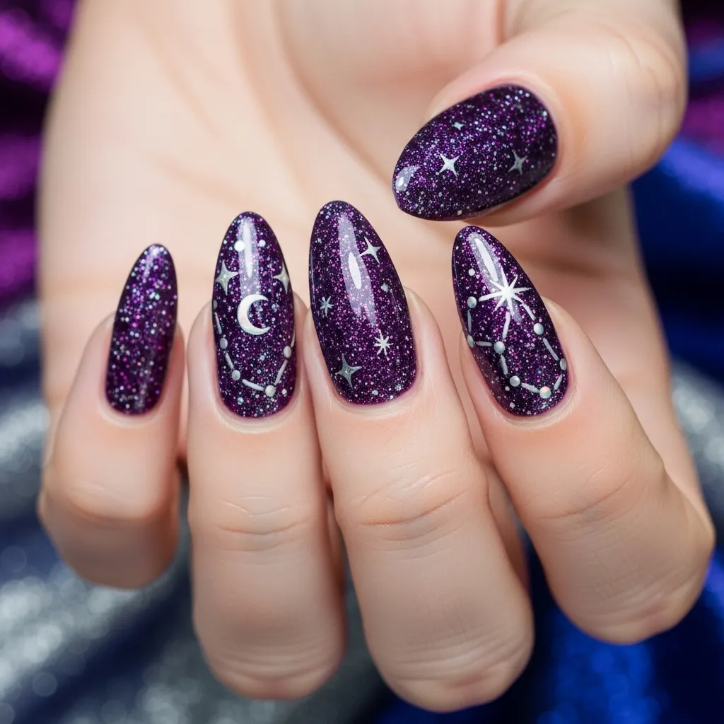 Adding star decals, moons, or crystal accents can elevate the look further. Purple glitter nails strike the perfect balance between spooky and elegant.