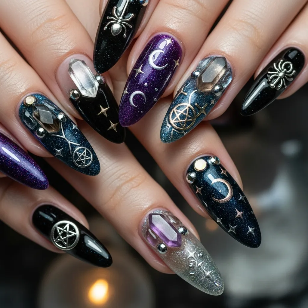 Channel mystical energy with crystal-inspired nail art. Gemstone designs in purple, black, and silver bring a magical vibe to your manicure.