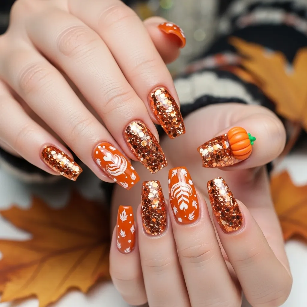 Combine fall’s pumpkin spice aesthetic with Halloween flair. Burnt orange glitter paired with black accents creates a cozy yet festive design.