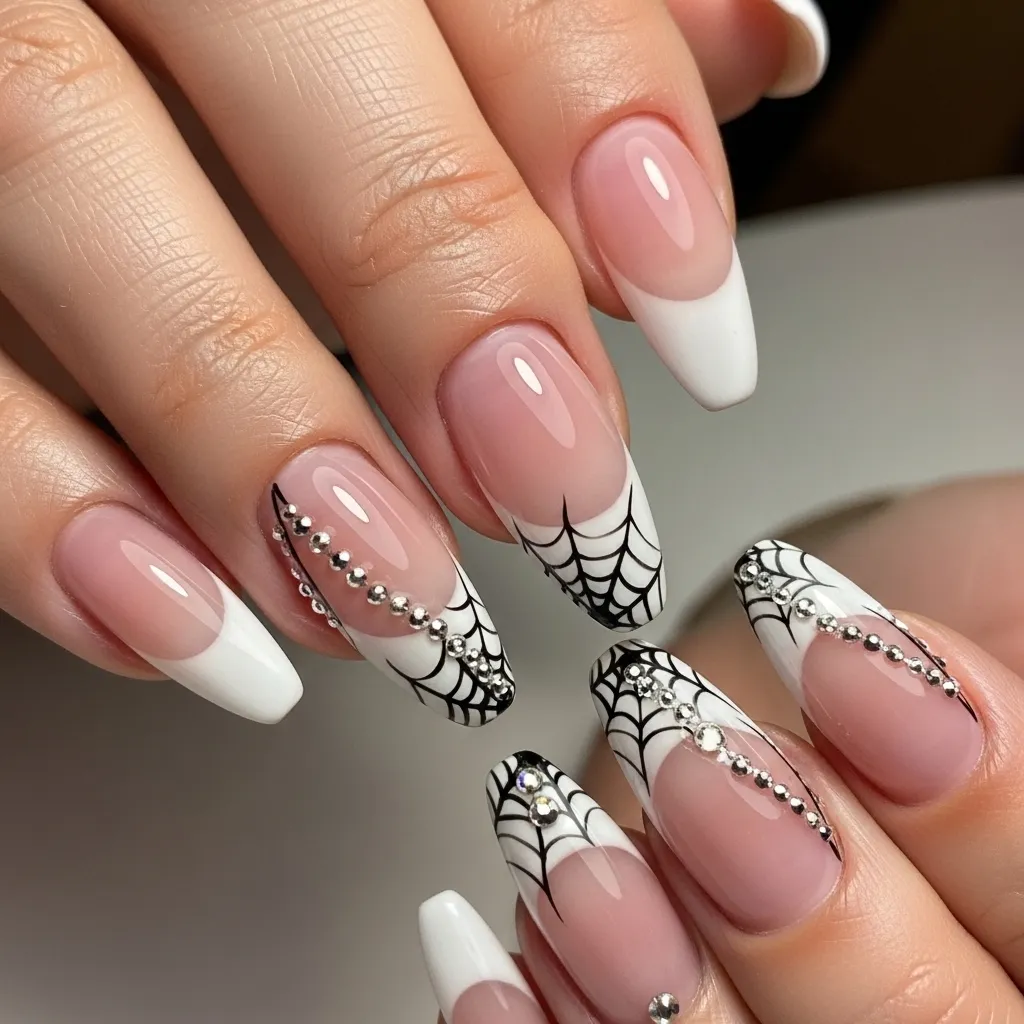Pairing the webs with tiny rhinestones creates a sparkling effect that looks glamorous under evening lights. Spider web nails are perfect for anyone who wants subtle spookiness without going over the top.
