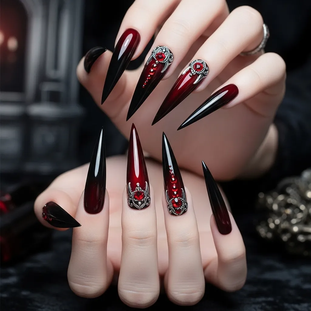 Tiny fang accents or blood-drip tips transform your nails into a vampire-inspired masterpiece. Red, black, and nude color palettes work best for this design.