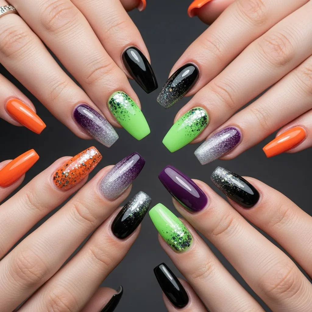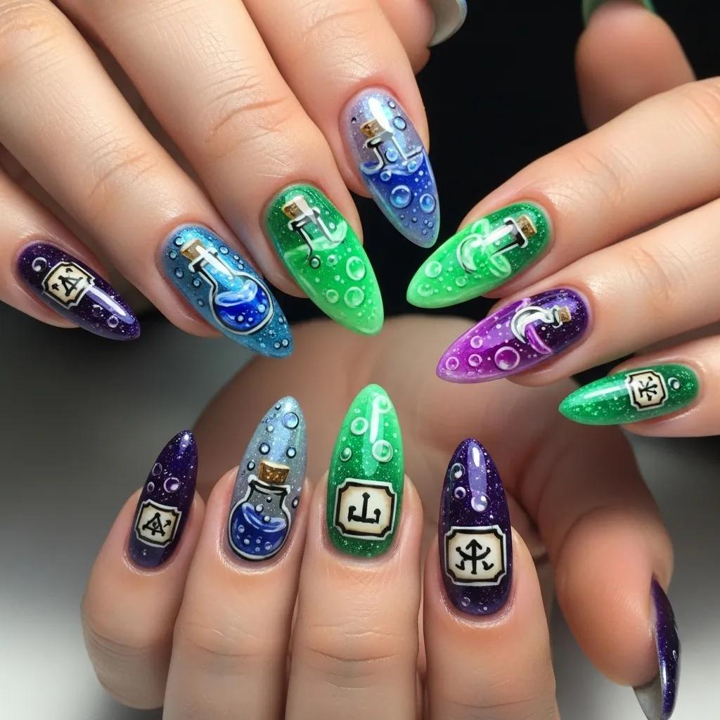 Potion bottle designs, glitter swirls, and neon accents create a witchy, mystical vibe. Potion-inspired nails are colorful and fun, with endless opportunities for creativity.
