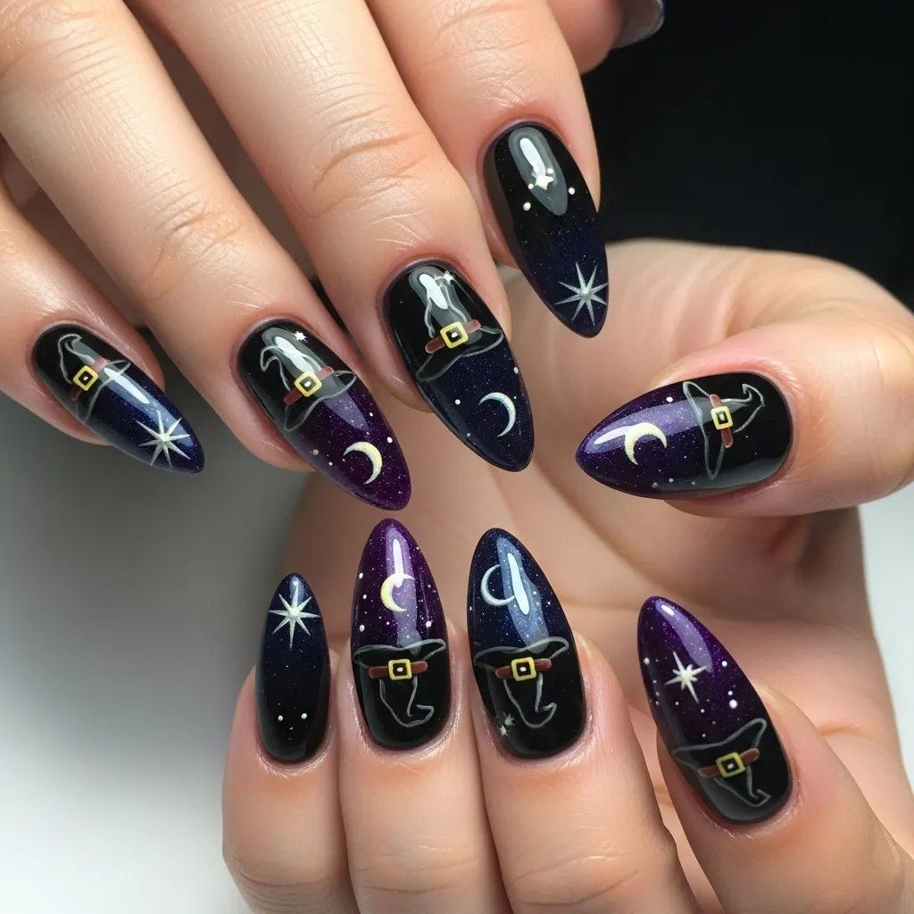 You can combine them with stars, moons, or broomstick details for added magic. Witch hat nails work beautifully on stiletto or coffin shapes where there’s enough space to showcase detail.
