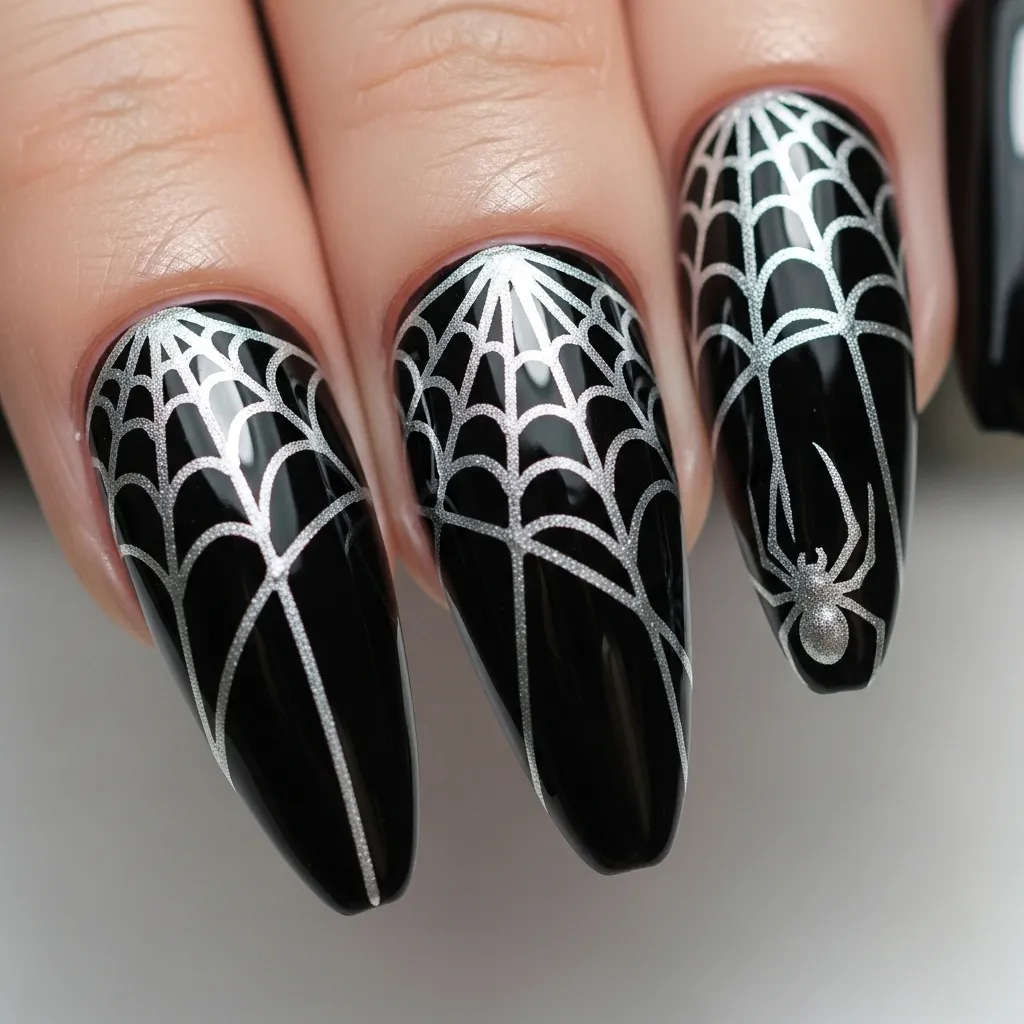 Delicate spider web patterns painted in silver, white, or glitter over dark polish make a bold Halloween statement. These designs are intricate yet stylish, leaning more toward chic than scary.