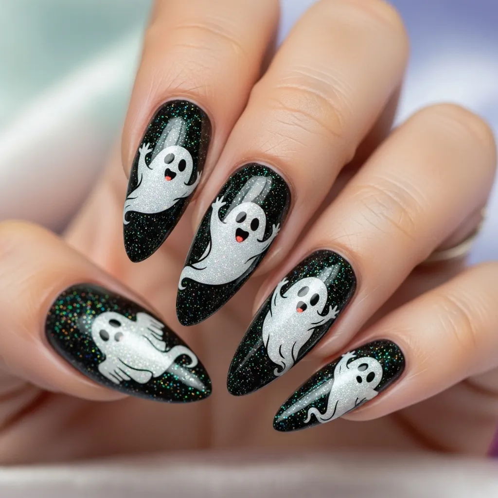 Cute little ghosts painted with sparkly backgrounds make for an adorable Halloween nail option. Instead of being scary, these ghosts are playful and fun.