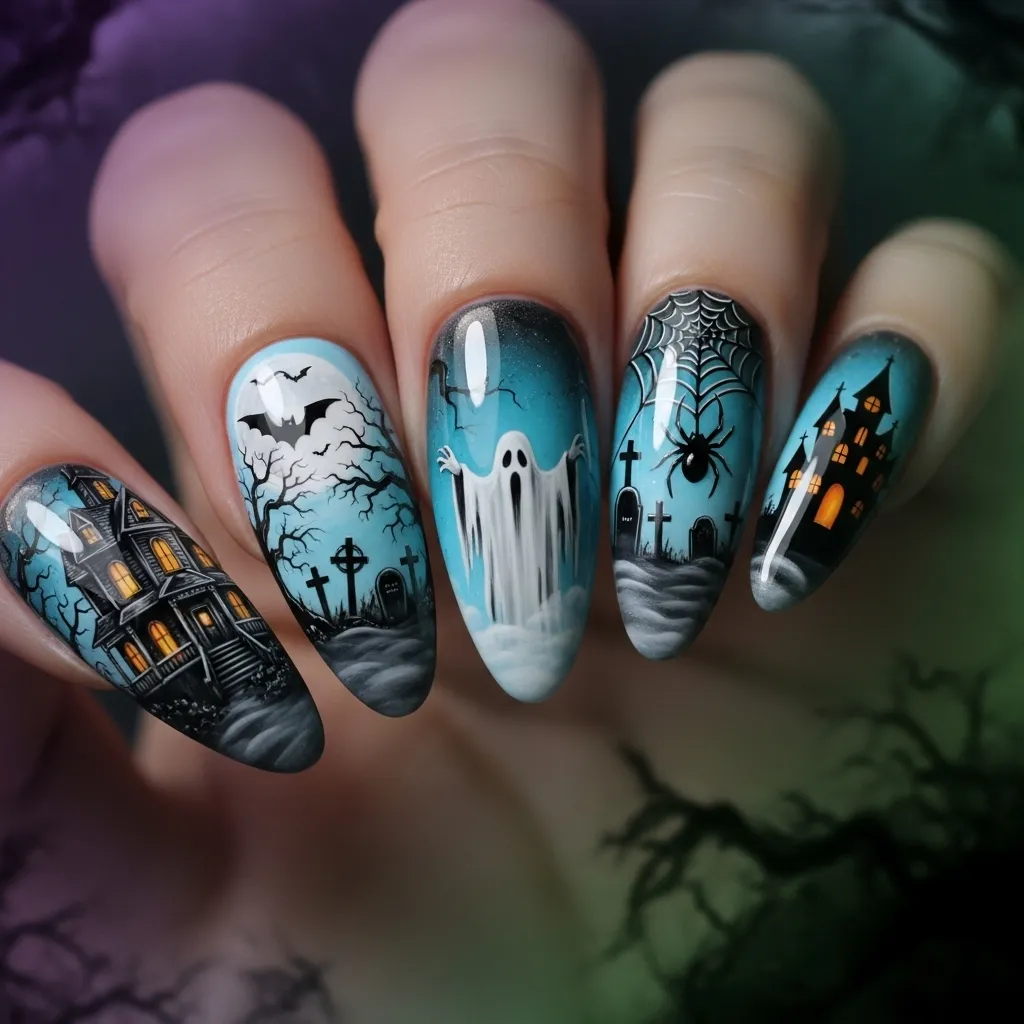 If you love detailed nail art, a haunted house design is a must. Dark backgrounds with tiny houses, bats, and glowing windows turn your nails into spooky storyboards.