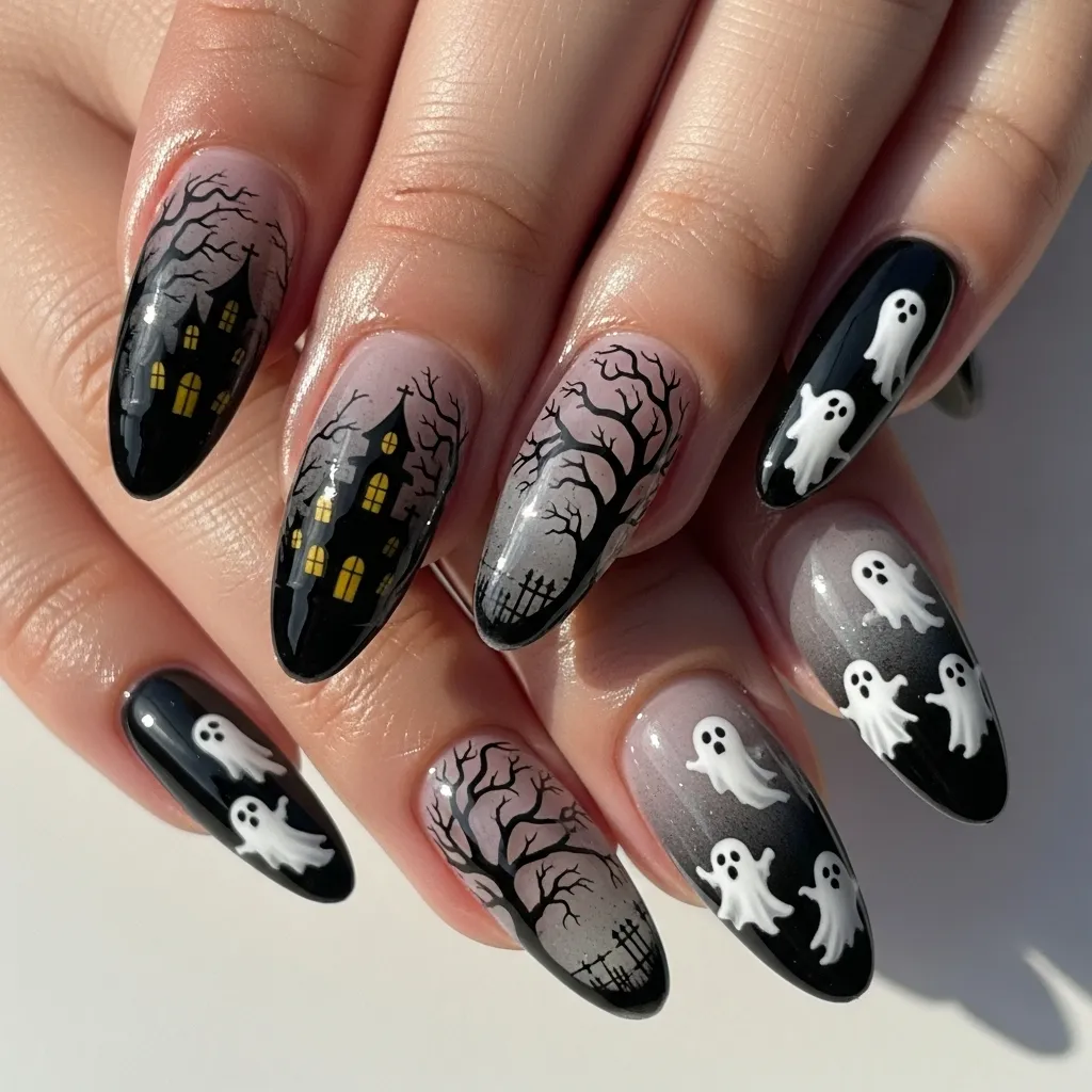 Haunted house accent nails are a detailed, artistic option for Halloween lovers. The design often features miniature haunted houses, ghostly figures, and bare trees against a dark gradient background, creating a spooky landscape. Each nail can tell a part of the story, offering a cinematic and eerie visual impact.