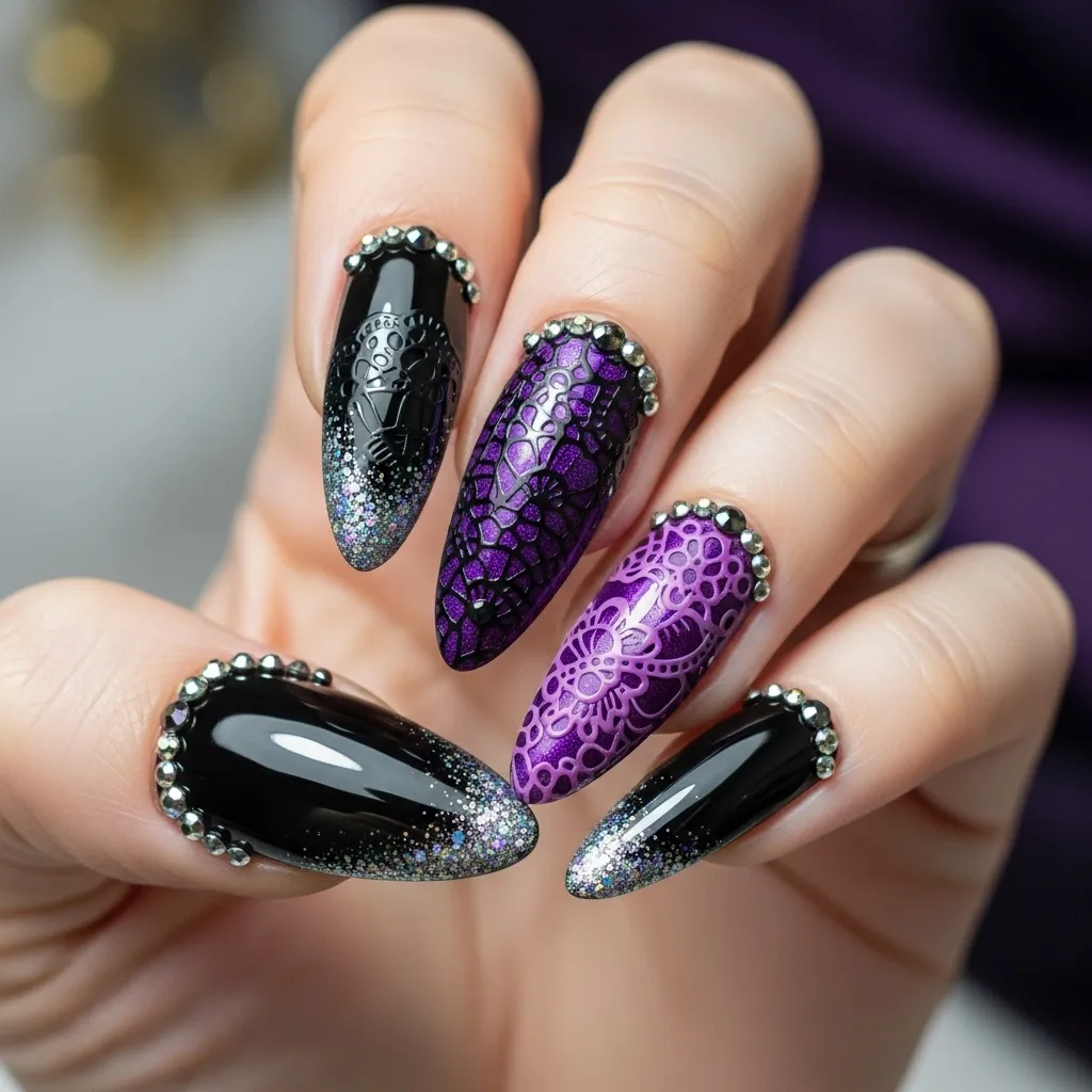 Gothic lace nails combine elegance with dark, mysterious vibes, perfect for stylish Halloween celebrations. The lace patterns can be painted or stamped over black, purple, or deep red acrylics, often complemented with subtle glitter or rhinestone accents for sophistication.