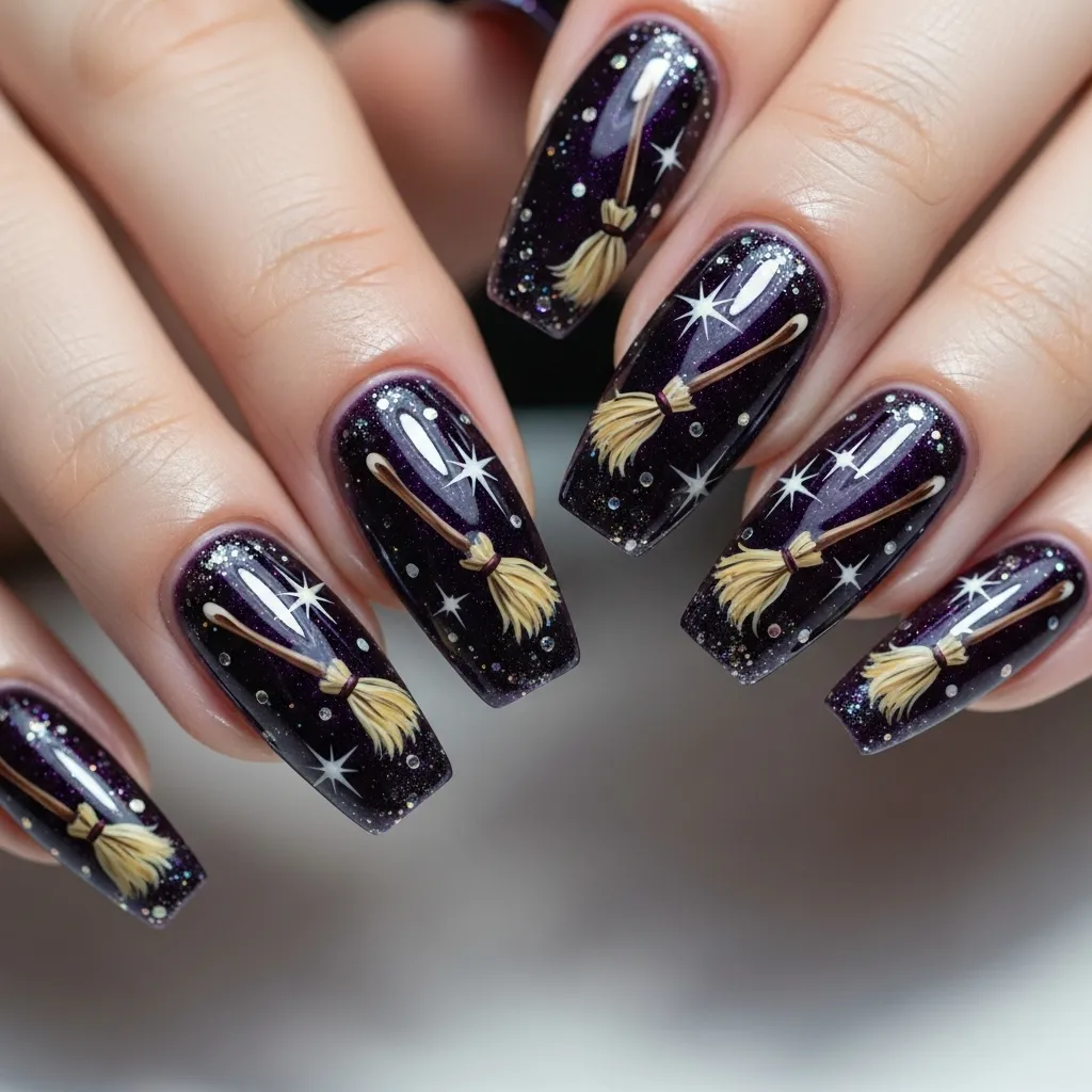 Witch broomstick nails are whimsical and charming, perfect for Halloween enthusiasts who love playful designs. Using dark bases like black or purple, miniature broomstick motifs paired with stars or glitter accents create a magical scene on each nail.