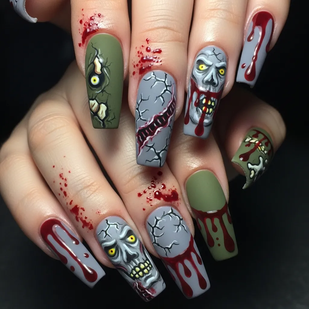 Zombie apocalypse nails are perfect for horror enthusiasts seeking a dramatic Halloween manicure. Using gray, green, and muted tones, the nails feature intricate zombie faces, cracked skin effects, and splashes of red for blood-like details. This design captures the essence of a post-apocalyptic horror scene, ideal for cosplay or themed parties.