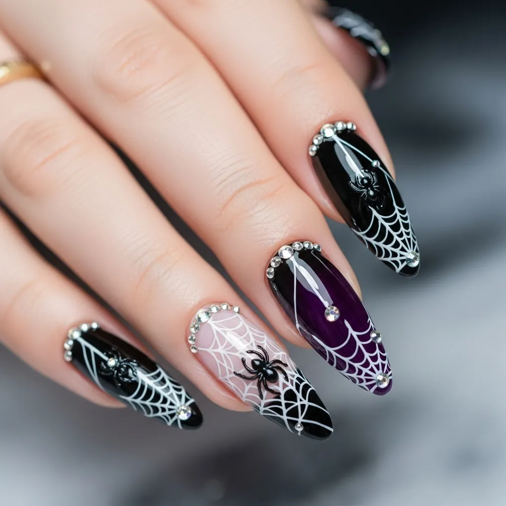 This nail style works well with a variety of base colors—classic black, deep purple, or blood red—for a more dramatic effect. Perfect for costume parties, Halloween-themed events, or social media photo-ready nails, this design brings sophistication to spooky season nail art. Adding subtle 3D spider charms can enhance the Halloween vibe even further. These nails are an excellent choice for women who want to balance detailed art, sparkle, and festive charm.
