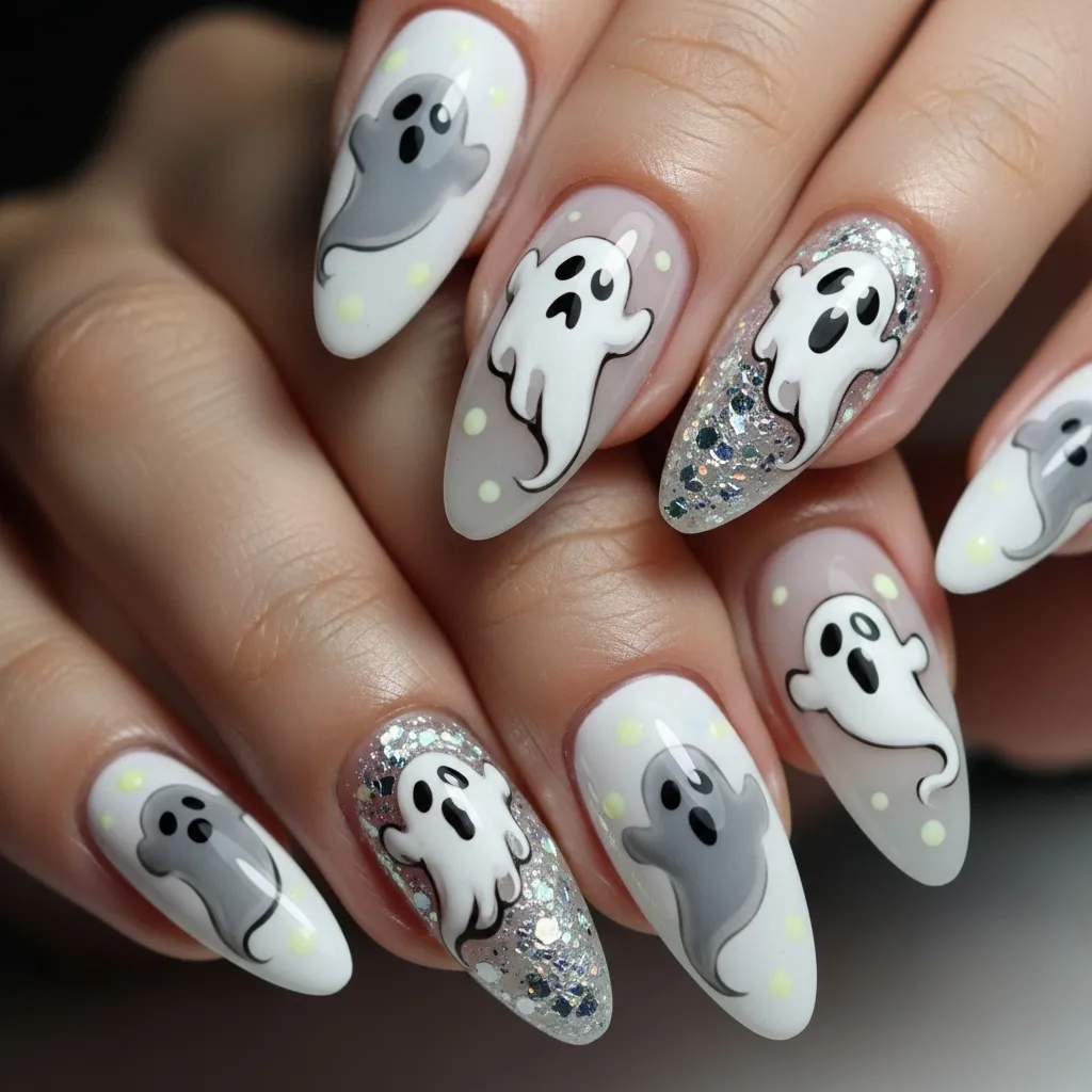 Ghostly glow nails are fun, festive, and slightly spooky. Using white and pale gray tones as the base, tiny ghost silhouettes can be hand-painted across each nail, while shimmer and glow-in-the-dark finishes add magical flair. This manicure is perfect for those who want a playful Halloween aesthetic without overly gory details.