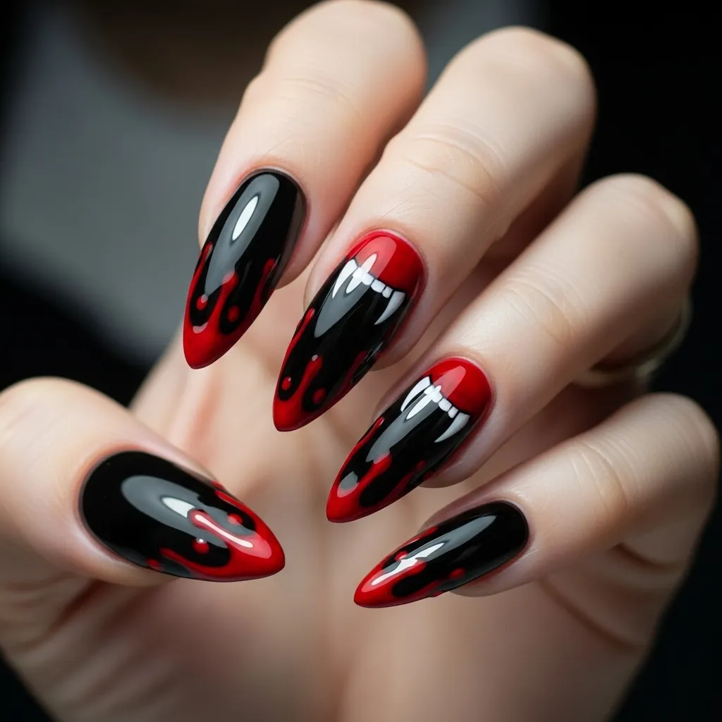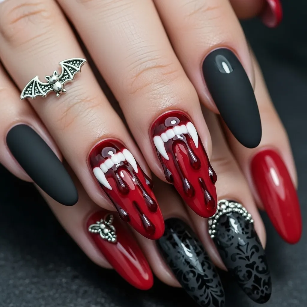 Vampire fang nails are a dramatic, horror-inspired choice that embodies spooky sophistication. Using black or dark red bases, the tips can be styled with red dripping designs that mimic blood, accentuating the vampire aesthetic. Tiny fang motifs on accent nails can add creativity without overwhelming the entire look.