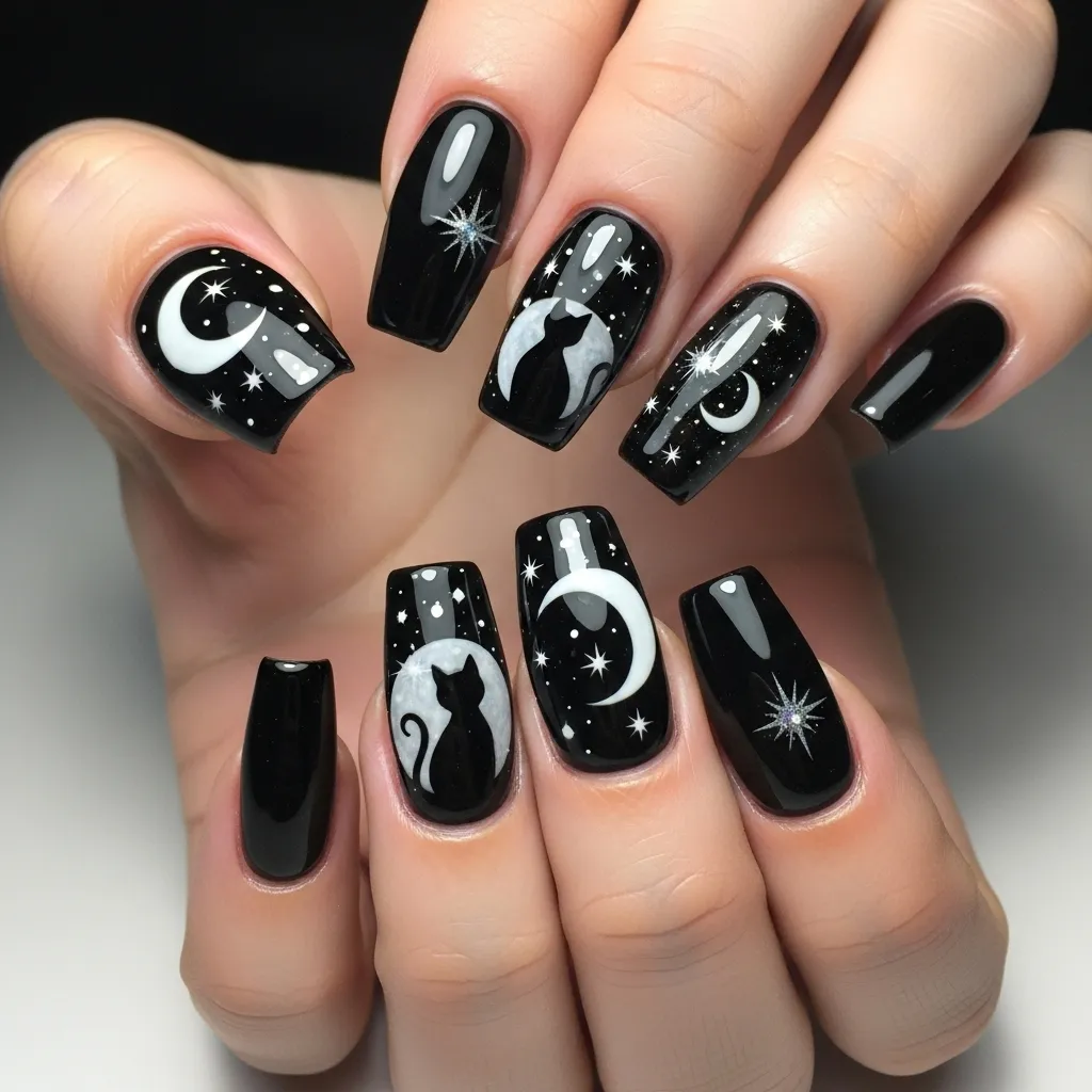 21. Black Cat & Moonlight Nails