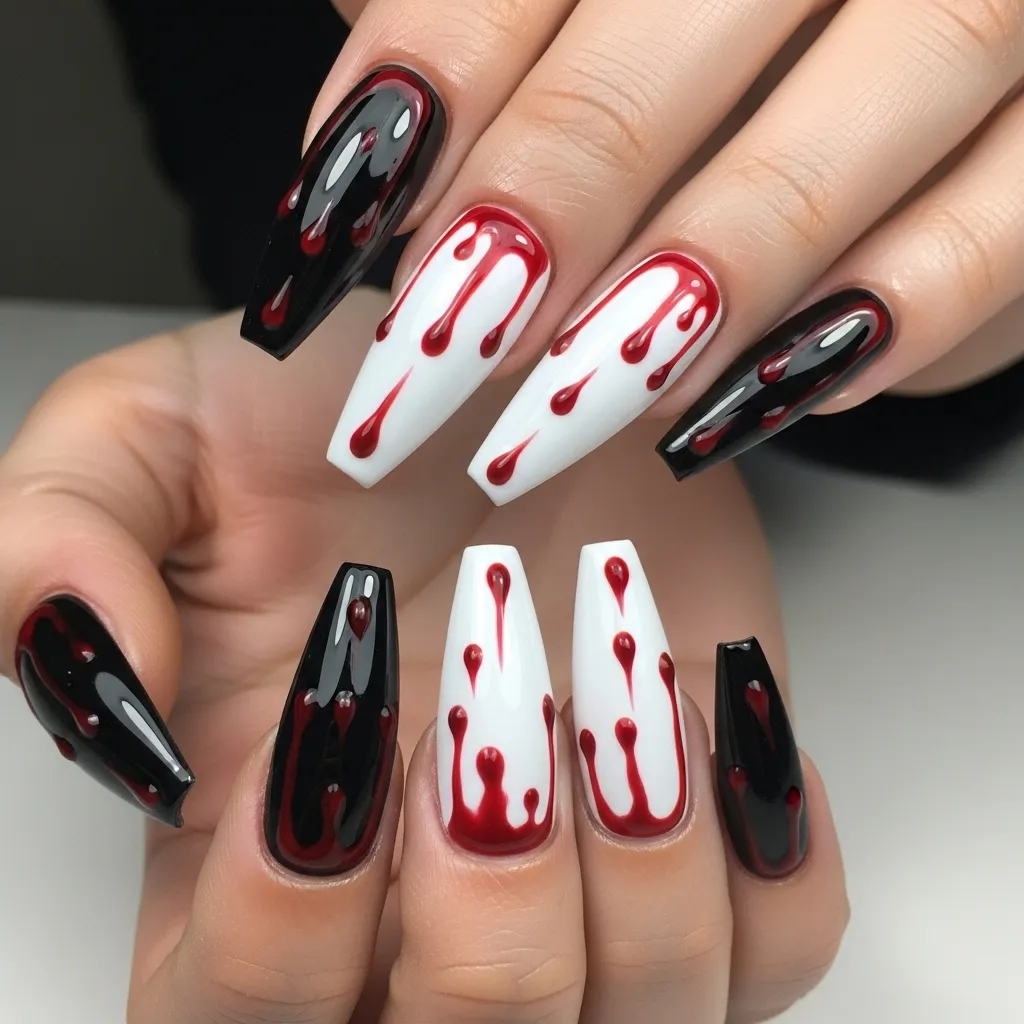 Blood drip nails are ideal for horror enthusiasts and bold Halloween lovers. The design mimics dripping blood, creating a realistic yet dramatic effect. This can be achieved with red gel polish over black, white, or nude bases for maximum contrast. Textured layers and glossy topcoats give depth to the dripping effect.