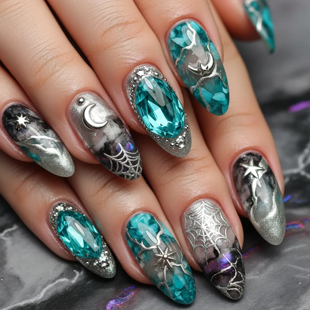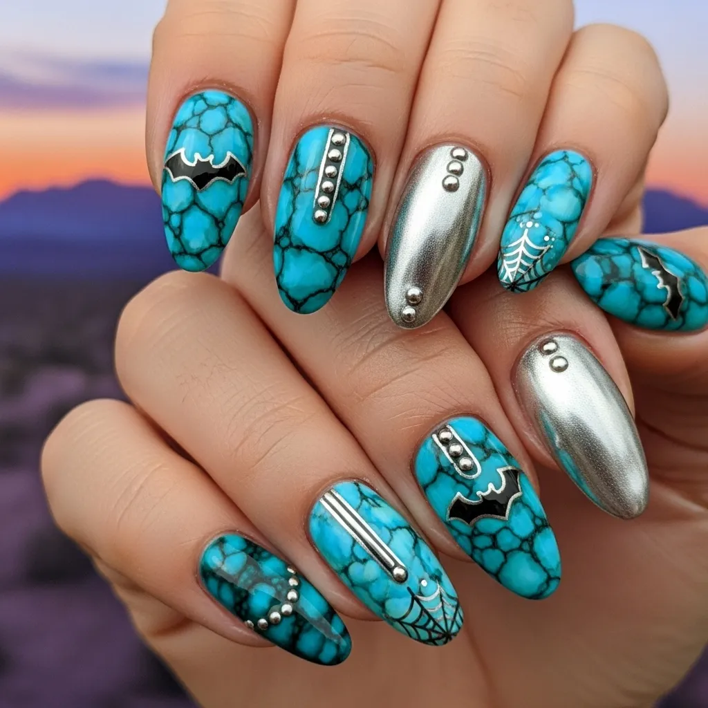 These nails can also include moon charms or desert-inspired designs for extra depth. They’re versatile, glamorous, and perfect for costumes that lean into mystical or Western themes. Turquoise and silver nails add sparkle and sophistication, making them a seasonal standout.