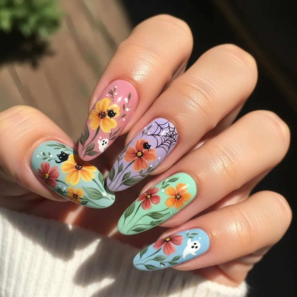 Prairie flower nails bring a softer, unexpected vibe to Halloween style. Using pastel or muted tones, floral accents are painted delicately across each nail, accented by soft green stems. Though not traditionally spooky, the rustic charm ties into fall’s natural aesthetic. Paired with a Long Pixie Bob, these nails create a charming contrast—combining sweetness with edgy hair.