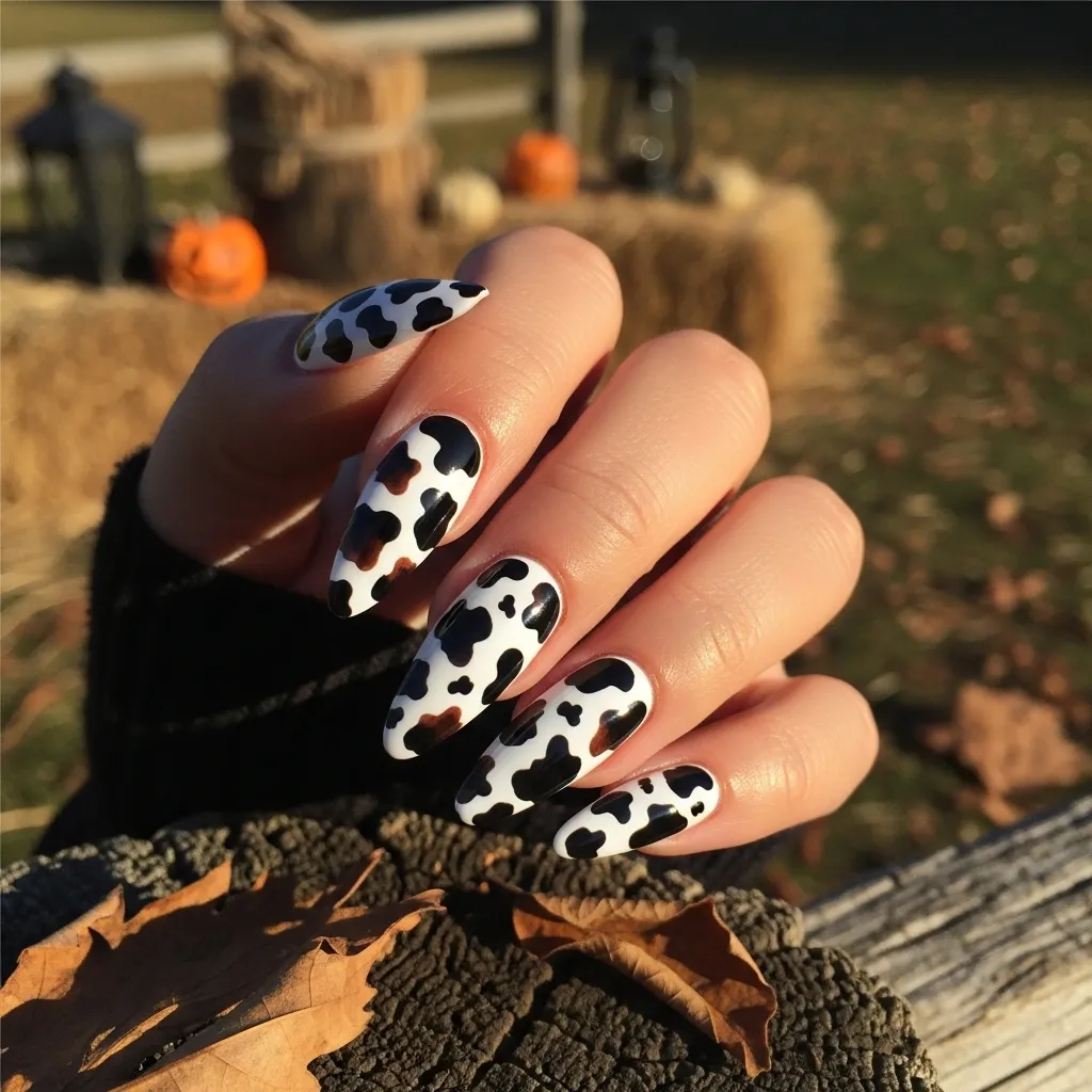 Cowhide print nails are a Western staple with a fun Halloween twist. Using a white or cream base, artists create irregular black and brown spots for a cow-print effect. The rustic yet trendy style pairs beautifully with cowboy costumes and complements a Long Pixie Bob for an edgy-meets-playful vibe.