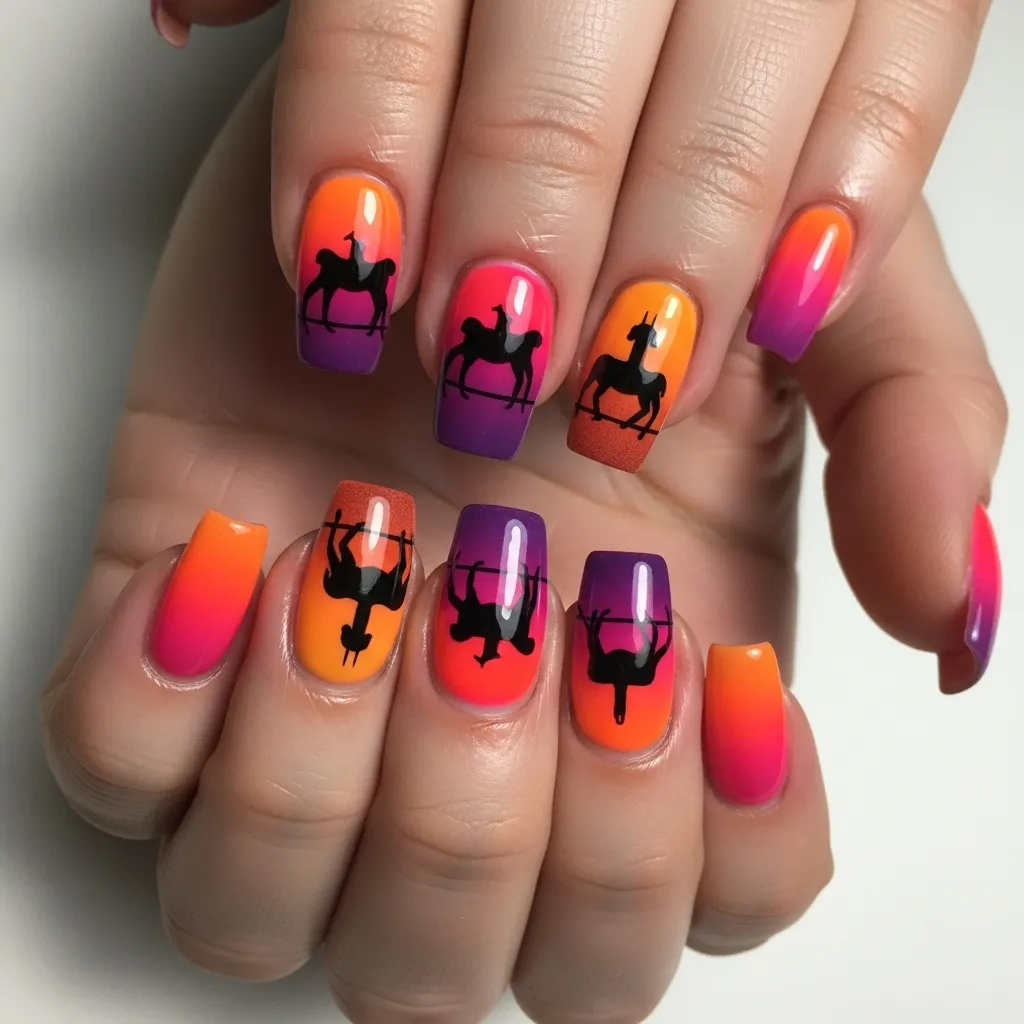 Sunset rodeo nails capture the dramatic colors of a desert horizon. Ombre gradients in fiery orange, pink, and purple create a glowing background for painted cowboy or horse silhouettes. The result is vibrant, bold, and festive. Styled with a Long Pixie Bob, they create a head-turning combination of modern chic and dramatic flair.