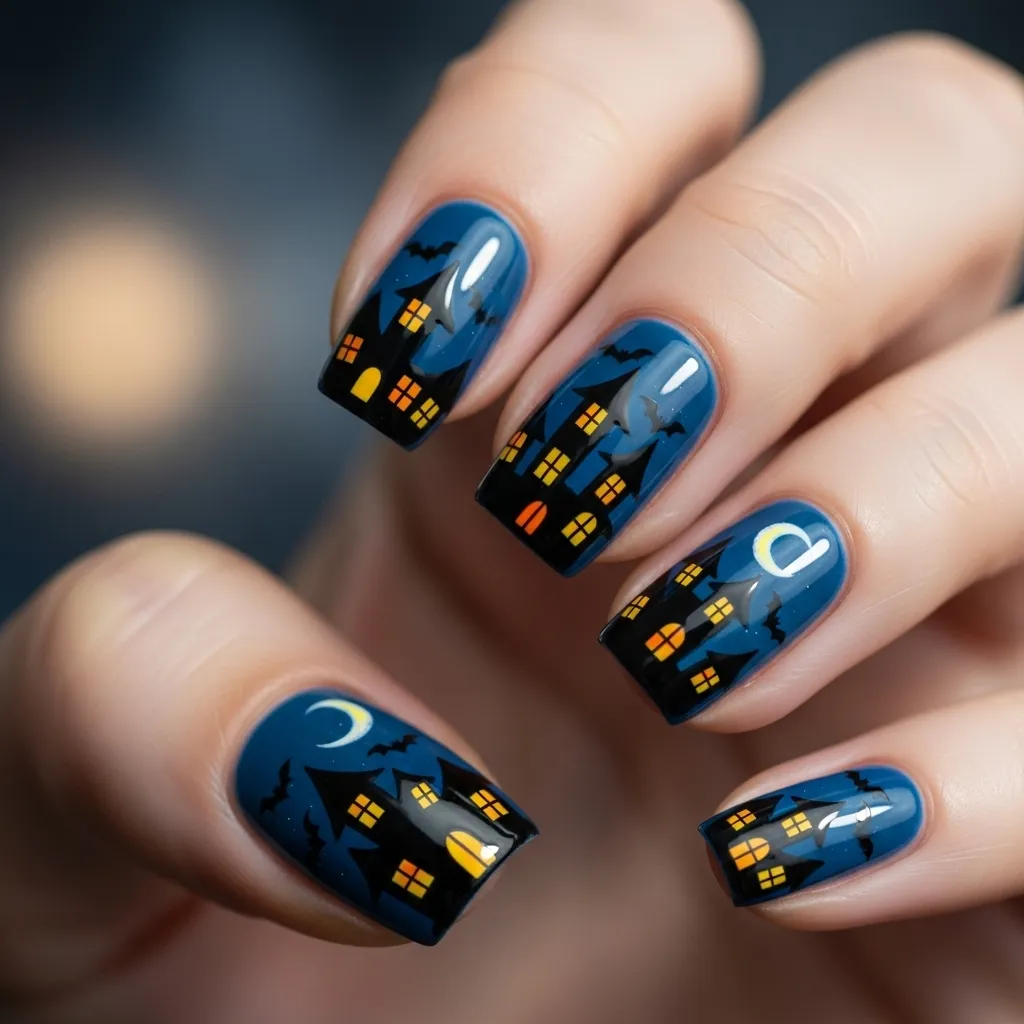 For more flair, you can add 3D embellishments such as rhinestone stars or glow-in-the-dark polish to make the design come alive in the dark. These nails are best for Halloween parties where you want your hands to steal the show. Whether paired with a witchy outfit or a sleek modern dress, haunted house nails strike the perfect balance between scary and stylish.